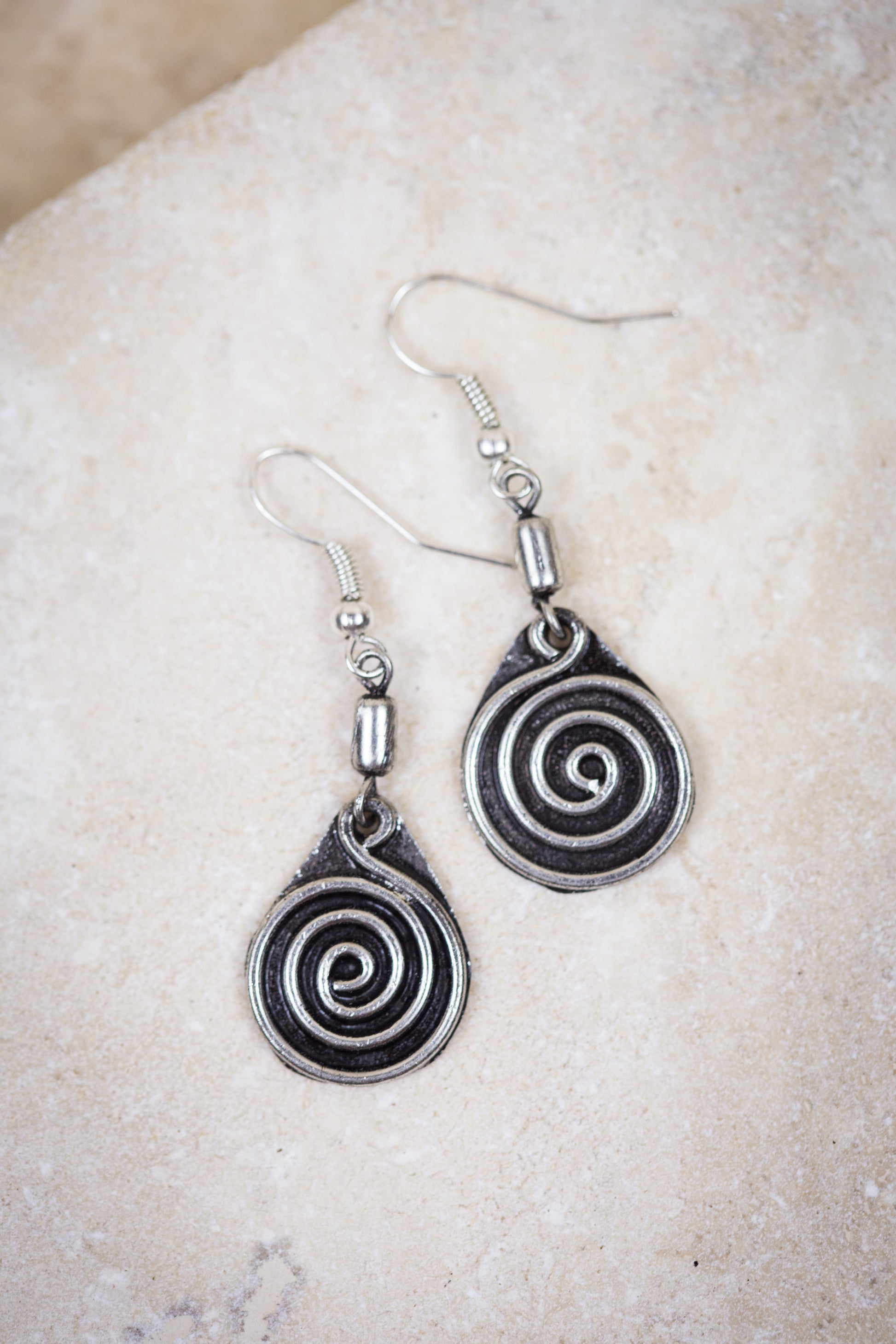 A statement of understated elegance to grace every beauty! These timeless earrings are designed from our logo which signifies making an impact on people's lives. These black earrings dangle down and are simple yet elegant and graceful. They feature a unique swirl pattern to show the ripple effect that you make when you purchase these earrings on the lives of human trafficking victims.