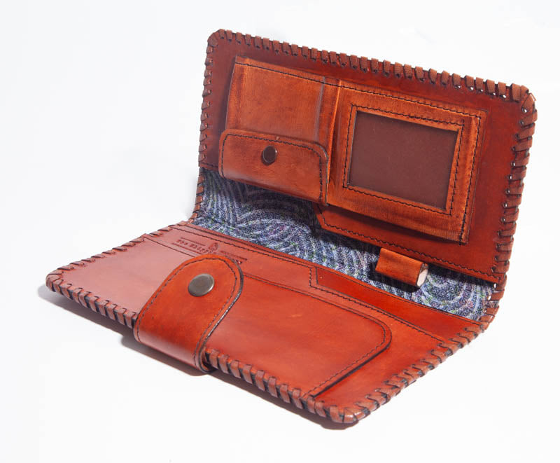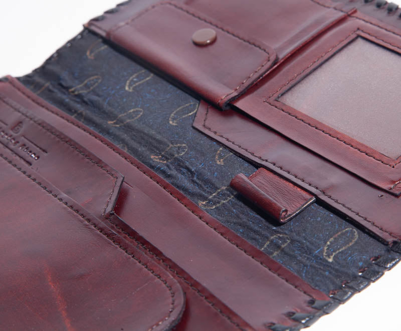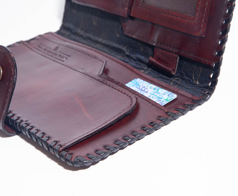 Description: Leather with a clear ID pocket and several card holders, bill sleeves, as well as a coin pouch. Button clasp latch.
