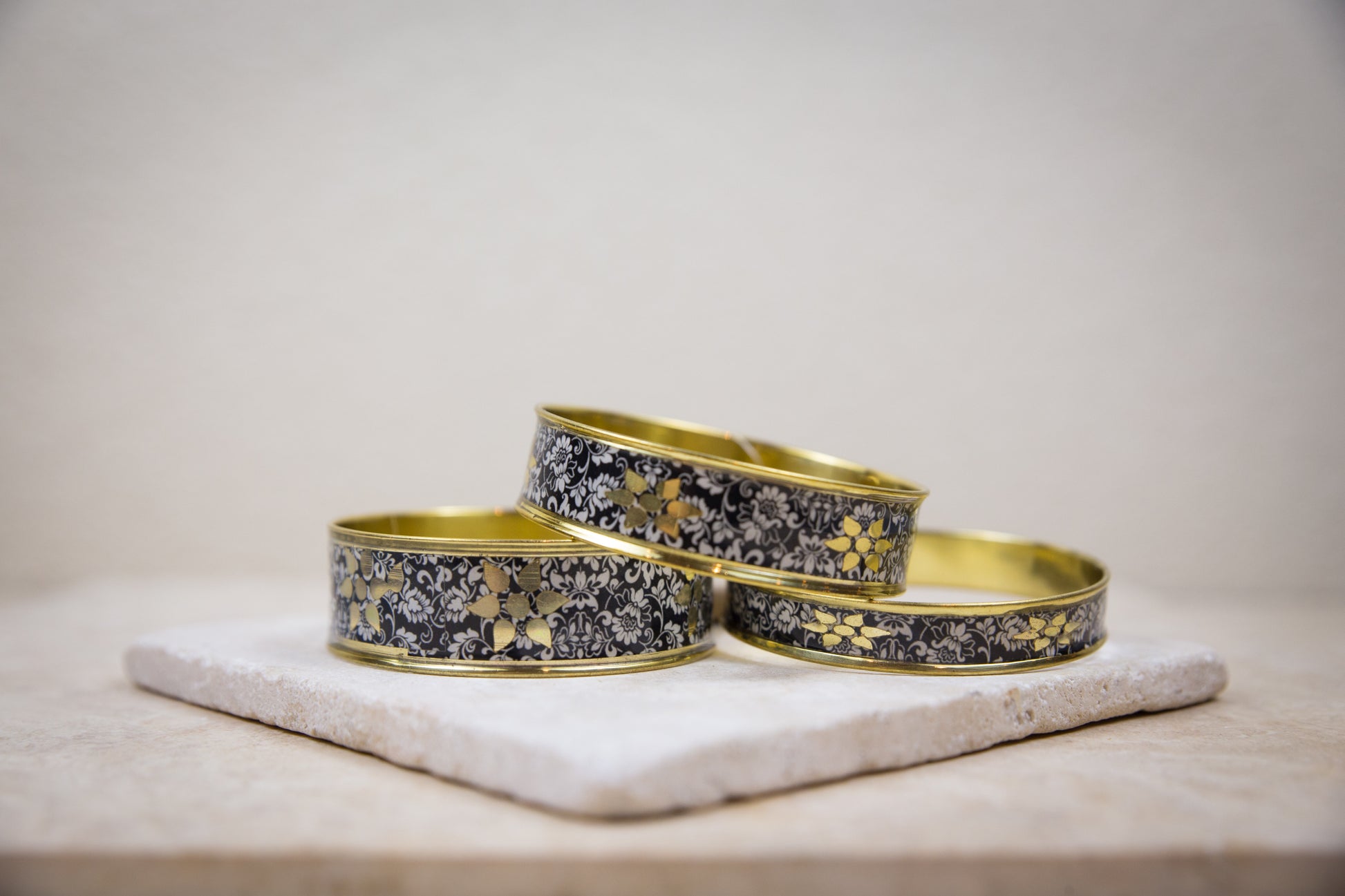 Our Handcrafted Kusum Bracelet is simply beautiful. The varying widths of the three bangles allow you to create variety and mix and match this piece however you want to create the perfect look. The variety of sizes within this set along with detailed graceful floral black and white patterns makes this piece shine like no other as the golden interior shines within.