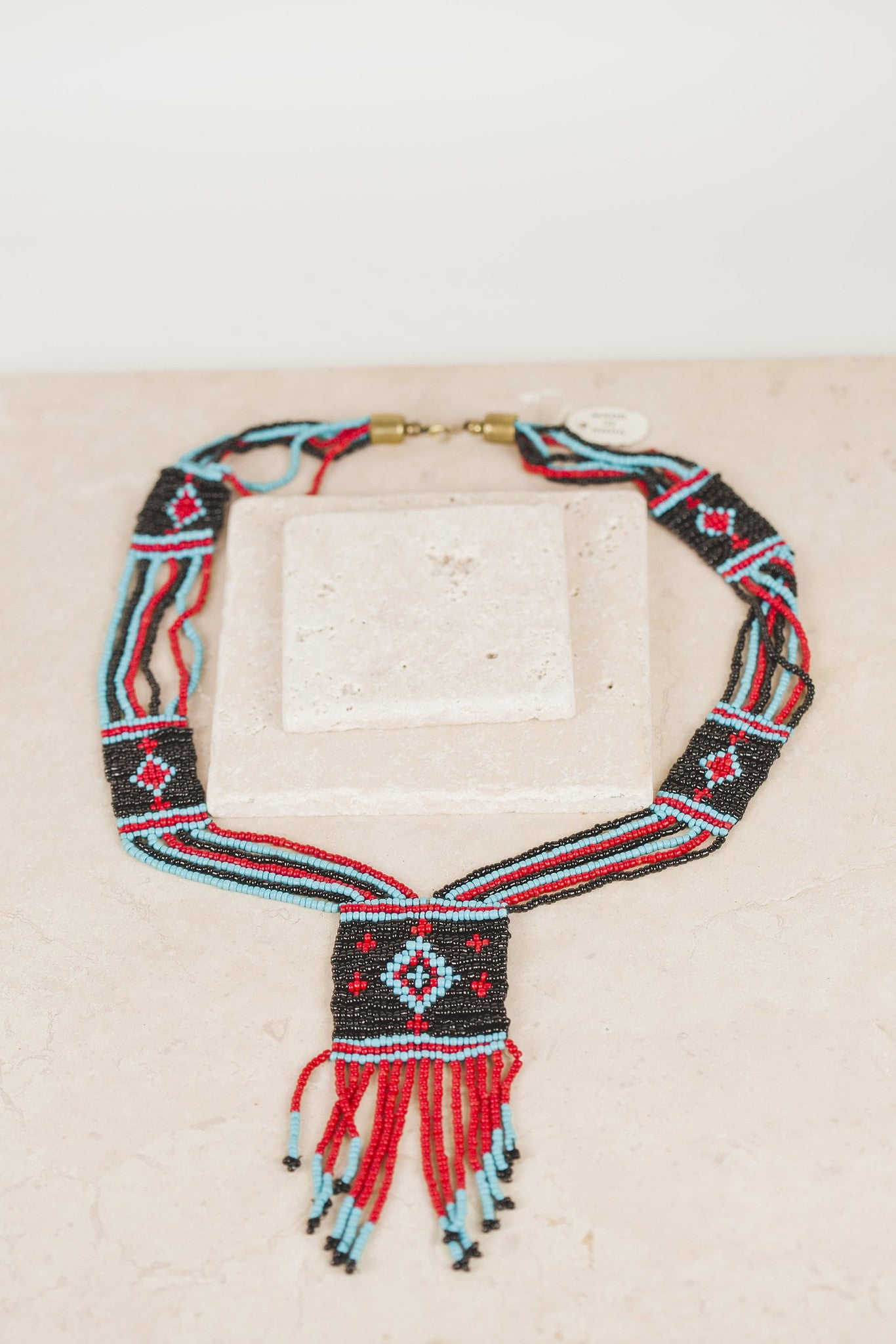 A bold and distinctive statement of Nepalese craftsmanship. This beaded black, turquoise and red necklace is a statement piece that is unique.