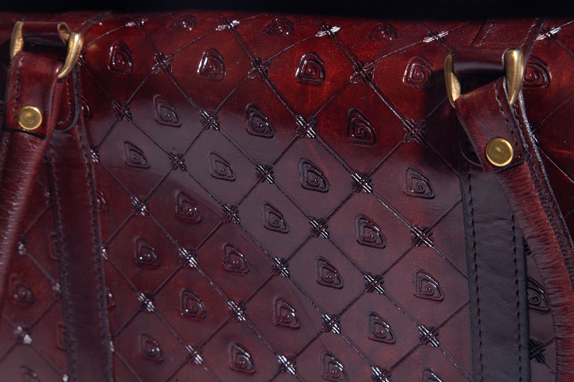 Description: Exterior signature Ripple hand-stamped designs, exterior 20" shoulder straps, 1 zippered compartment, 1 slip pouch, and 4 card-size slip pouches.